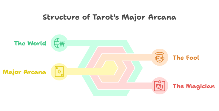 A standard tarot deck consists of 78 cards, divided into two main sections: the Major Arcana and the Minor Arcana.